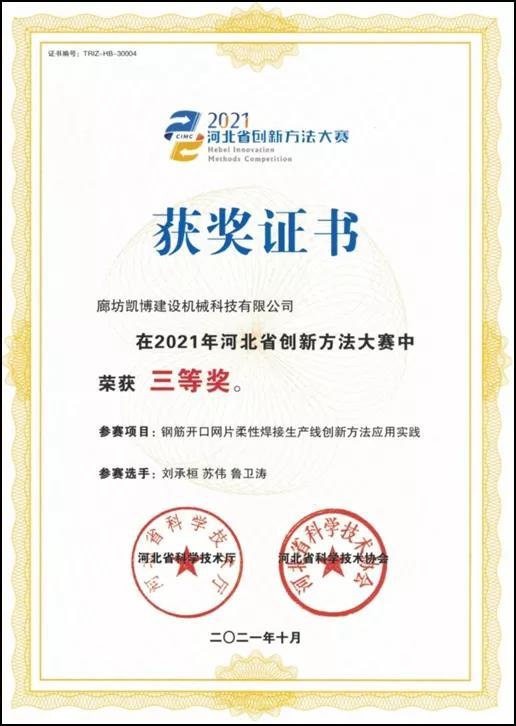 廊坊凱博建設(shè)機械科技有限公司(以下簡稱“凱博科技”)完成的“鋼筋開口網(wǎng)片柔性焊接生產(chǎn)線創(chuàng)新方法應用實踐”項目在2021年河北省創(chuàng)新方法大賽中榮獲三等獎。此次參賽是凱博科技創(chuàng)新團隊第二次參加河北省創(chuàng)新方法大賽,2019年凱博科技“教學型塔式起重機”項目曾獲“2019河北省創(chuàng)新方法大賽三等獎”。