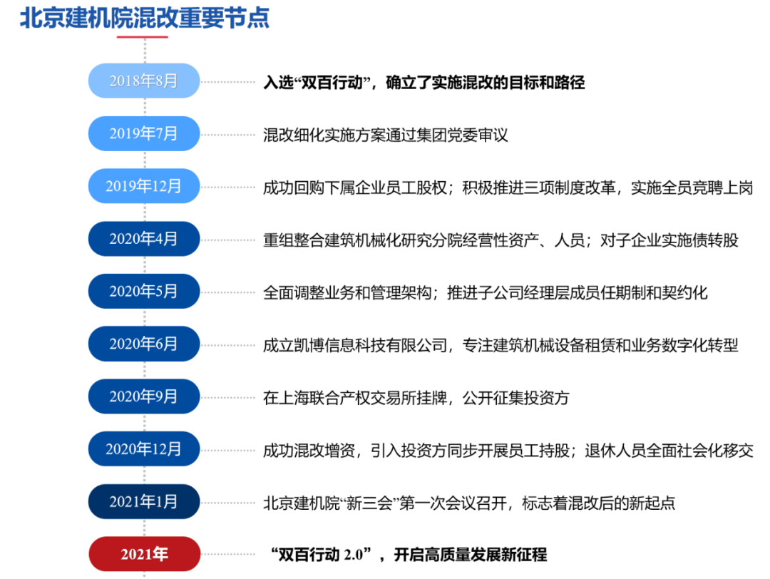 ? ? 2020年12月,北京建機(jī)院通過上海聯(lián)合產(chǎn)權(quán)交易所成功引入中泰云智裝備制造(山東)有限公司、國新雙百壹號(杭州)股權(quán)投資合伙企業(yè)(有限合伙)、淮北建元綠金碳谷創(chuàng)業(yè)投資基金合伙企業(yè)(有限合伙)、海安市申菱電器制造有限公司等4家民營企業(yè)和金融資本,同步實施員工持股,募集資金近4億元。