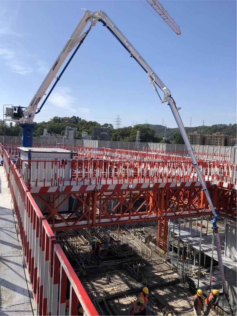 模架式液壓混凝土布料機(jī)自帶鋼平臺(tái)底座,與爬模架體連接傳遞施工載荷,無(wú)需自帶動(dòng)力系統(tǒng),爬模爬升時(shí)帶動(dòng)其爬升。其中HGY21模架式液壓混凝土布料機(jī)于2021年11月成功應(yīng)用在使用“住宅造樓機(jī)”的裝配式建筑領(lǐng)域(中建三局承建的廣州大源村項(xiàng)目)。