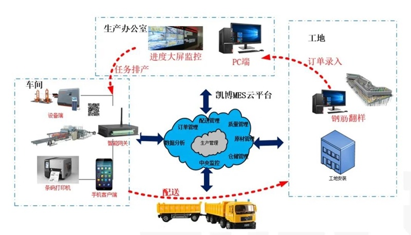 并且,凱博科技攜手中國(guó)鐵道科學(xué)研究院集團(tuán)有限公司,開發(fā)凱博鋼筋加工管理軟件系統(tǒng)和鋼筋加工遠(yuǎn)程控制系統(tǒng),打造智能控制中心。鋼筋加工管理軟件系統(tǒng)以鋼筋加工過程中物資流管理為核心,借助工業(yè)互聯(lián)網(wǎng)、云服務(wù)、智能設(shè)備等技術(shù)手段,實(shí)現(xiàn)多項(xiàng)目多任務(wù)遠(yuǎn)程訂單管理,實(shí)現(xiàn)訂單排產(chǎn)、生產(chǎn)訂單分發(fā)、生產(chǎn)標(biāo)牌打印、成品完成報(bào)工,成品出入庫(kù)等功能,同時(shí)能夠以電子大屏實(shí)現(xiàn)項(xiàng)目訂單動(dòng)態(tài)實(shí)時(shí)監(jiān)控、加工廠整體運(yùn)營(yíng)狀態(tài)的中心化顯示。鋼筋加工遠(yuǎn)程控制系統(tǒng),可實(shí)時(shí)顯示加工場(chǎng)各種設(shè)備生產(chǎn)狀態(tài),同時(shí)實(shí)現(xiàn)中控室對(duì)現(xiàn)場(chǎng)設(shè)備啟動(dòng)和停止的遠(yuǎn)程控制,造就了高鐵梁場(chǎng)鋼筋加工數(shù)字化新模式!